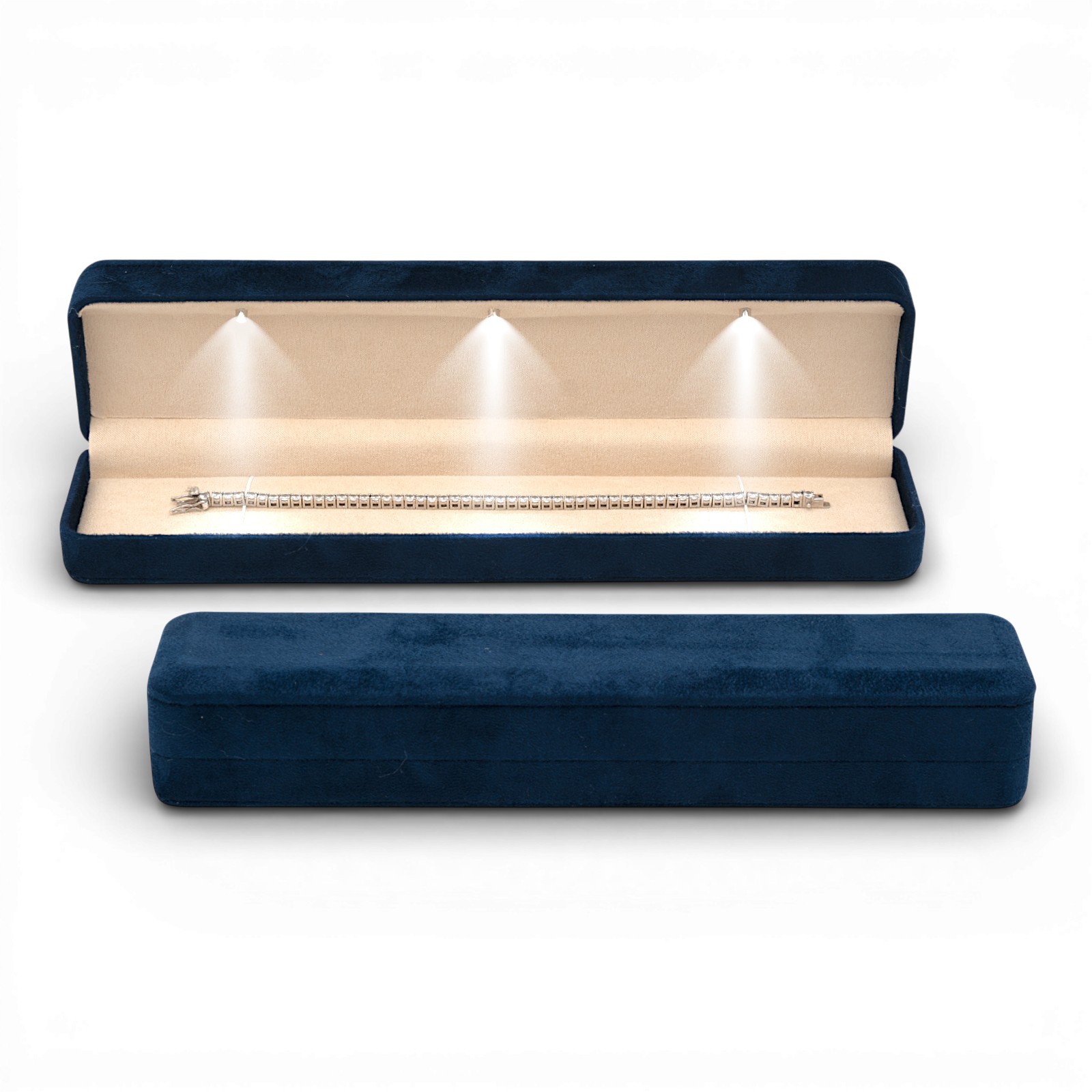 La luce LED integrata si attiva automaticamente all’apertura dell’astuccio, illuminando il bracciale e mettendo in evidenza dettagli, materiali e brillantezza. L’effetto luminoso migliora l’impatto visivo del gioiello e rende la presentazione più coinvolgente per il cliente.