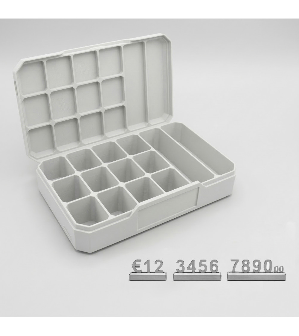 Organizzazione Intelligente: La scatola è suddivisa in scomparti dedicati per ogni singolo elemento (numeri 0-9, segno €, segno .00). Mai più ricerche affannose tra pezzi sparsi.